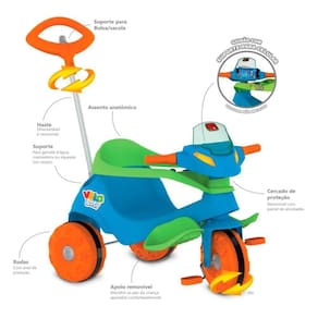 Funcao Passeio: O adulto utiliza a haste direcionavel para conduzir o triciclo. Basta, colocar o cercado de protecao e o apoio dos pes.