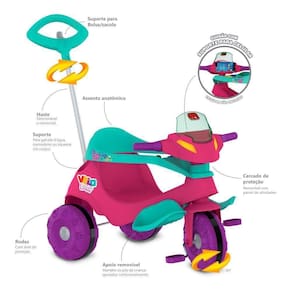 Funcao passeio: O adulto utiliza a haste direcionavel para conduzir o triciclo. Basta, colocar o cercado de protecao e o apoio dos pes.