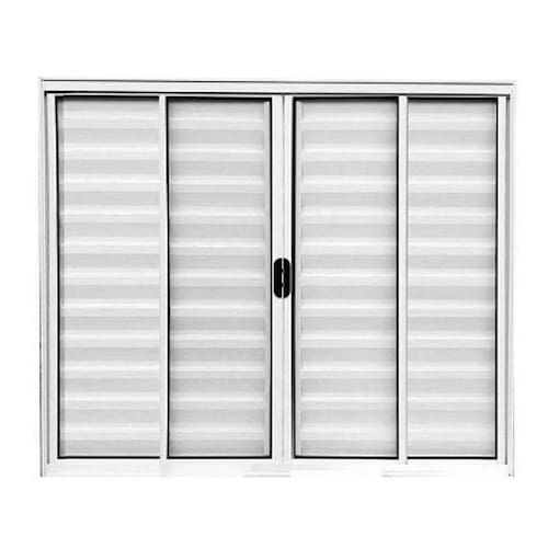 Veneziana 120x200 6 Folhas – Alumínio Branco – Linha 18 Modular Janela do tipo Veneziana com 2 folhas veneziana fixas e 2 folhas veneziana móveis (de correr) + 2 folhas de vidro móveis (de correr). Fecho central. Já vem com vidro incluso e pronta para instalar. Não enferruja. De fabricação própria.