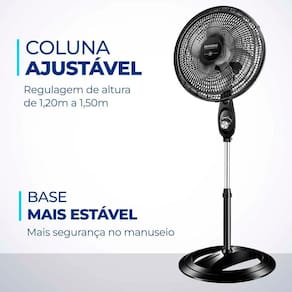Ventilador de 40cm + 6 pás: a linha de ventiladores super power alia o design à potência para promover maior intensidade do vento. É garantia de um ambiente fresco e agradável Coluna ajustável: possui regulagem de 1,19 a 1,50 metros, permitindo o ajuste ideal da altura do vento Mais silêncio e conforto: o sistema de ventilação da mondial apresenta baixo nível de ruído, assegurando o silêncio necessário para uma excelente noite de sono Maior distribuição de ar: o sistema oscilante contínuo permite maior fluxo de ar Inclinação vertical regulável: para um direcionamento ideal do fluxo do ar Controle de velocidade: as 3 opções de velocidade permitem adequar o vento à sua necessidade.