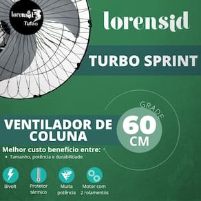 Ventilador coluna tufão sprint 60cm preto bivolt lorensid Turbo sprint 60 m3 coluna preto bivolt Com matéria prima de alta qualidade, os ventiladores lorensid possuem um excelente desempenho associado a um baixo consumo energético. Toda gama de produtos é equipada com relé térmico de proteção. Possuem um design prático e moderno e são de fácil instalação e desinstalação para limpeza. Observação: É necessário mudar a chave de tensão voltagem de acordo com a tensão da sua casa, para que o produto funcione corretamente e não queime a chave fica localizada na parte do motor do ventilador Características: - possui controle de velocidade - possui oscilação para direta e esquerda - pode ser inclinado para frente ou para trás - grade de aço removível para facilitar a limpeza - ideal para lojas, escolas, restaurantes, escritórios, igrejas, indústrias, e ambientes que exijam uma boa ventilação. Especificações: - marca: loren-sid - modelo: sprint - pás: 3 pás - tipo: ventilador de coluna/pedestal - tensão: bivolt - potência: 155w - frequência: 60hz - chave seletora: 127/220v - diâmetro da grade: 60cm - diâmetro da hélice: 52cm - consumo de energia kwh/mês : 4,92 - eficiência energética m/s /w M: 0,003 - rotação: 1250 1400rmp - cor: preto Perguntas frequentes: 1- os produtos são Sim, todos os nossos produtos são . 3- emitem Sim, todos nossos produtos acompanham . Marca: Não Informado