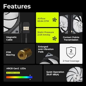 Cada ventilador é equipado com 8 LEDs ARGB GEN2, permitindo até 16,7 milhões de cores quando controlado pela placa-mãe.