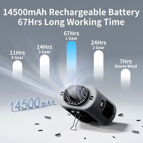 - ?4 níveis + 1 modo tempestade potente ajuste de vento?Equipado com um motor turbo de alta velocidade, o ventilador de cintura portátil pode atingir uma velocidade máxima de 14600 RPM, gerando fluxo de ar de até 6,3 m/s com uma distância de suprimento de ar de 2,5 m, resfriando em um segundo. Com 4 velocidades de vento ajustáveis e uma configuração de modo tempestade dedicada, de natural a forte, pode ser configurado para vários modos com base em suas necessidades, tornando-o ideal para trabalhadores da construção civil que em ambientes de alta temperatura