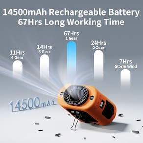 ?Ventilador multifuncional de clipe de cintura 5 em 1?Um ventilador de clipe de cintura integrado, ventilador de mesa, ventilador portátil e ventilador de pescoço. Prenda o ventilador em suas camisas, cintos e calças, ou pendure o ventilador pessoal em volta do pescoço com o cordão. Coloque-o em uma mesa com um suporte no ventilador corporal, mantendo as mãos completamente livres?Tempo de trabalho duradouro?O ventilador de cintura portátil pode funcionar continuamente por até 67 horas em baixa velocidade. Leva 6,5 horas para carregar totalmente e suporta o carregamento durante o uso. A velocidade máxima do vento persiste por 8 horas, enquanto a velocidade mínima do vento pode durar até 67 horas, ajudando você a vencer o calor durante todo o dia (nenhuma bateria de lítio independente é vendida com o produto)?4 níveis +1 modo de tempestade. Ajuste poderoso do vento?Equipado com um motor turbo de alta velocidade, o ventilador de cintura portátil pode atingir uma velocidade máxima de 14600 RPM, gerando fluxo de ar de até 20,66 pés/s com uma distância de suprimento de ar de 8,8 2 pés, esfriando em um segundo. Com velocidades de vento ajustáveis em 4 marchas e uma configuração dedicada ao modo de tempestade, do natural ao forte, pode ser configurado para vários modos de acordo com suas necessidades, tornando-o ideal para trabalhadores da construção civil que, em ambientes de alta temperatura,?Ventilador giratório de correia de 360° com interruptor separado?O ventilador de cintura apresenta um design prático com duas braçadeiras de aço manganês voltadas para direções opostas, oferecendo opções de posicionamento versáteis. Prenda a braçadeira giratória de 360° atualizada para direcionar o fluxo de ar para cima, para baixo ou para os lados, garantindo o resfriamento de todo o corpo de vários ângulos. Além disso, um pequeno clipe fixo para evitar que sua camisa obstrua o fluxo de ar. O ventilador suspenso na cintura tem interruptores separados para lanterna, velocidade do vento e vento tempestuoso, facilitando a operação?Fonte de alimentação de emergência com luz?O ventilador da camiseta possui uma entrada 5V-2A tipo C para carregamento rápido de carregadores USB, laptops e carregadores de carro, bem como uma saída USB 5V-2A que serve como fonte de alimentação de emergência para carregar seu telefone celular em caso de queda de energia ou condições climáticas extremas. Um plugue de poeira com uma porta de carregamento para protegê-lo contra poeira e água. A luz LED embutida e a função SOS fornecem iluminação de longo prazo, perfeita para casa, escritório, viagens e uso externo?Saída de ventilador mais ampla com tampa de silicone?A ventoinha Cool Clip possui uma entrada e saída de ar ampliadas para um forte fluxo de ar. O ventilador de cinto portátil vem com uma capa protetora de silicone de alta qualidade para proteger contra quedas e danos, bem projetado para vários cenários de uso externo, atendendo a ocupações como trabalhadores da construção civil e agricultores?Shirt Clip Cooling Fan Onthe-Go?Devido ao tamanho compacto deste ventilador vestível, pesando apenas 380 gramas, facilita o transporte na mochila, é preso com segurança ao cinto e é confortável de usar sem parecer volumoso. Além de usar um escritório interno, o uso de um escritório interno também traz uma sensação refrescante às atividades ao ar livre, como trabalhar no pátio, pescar, caminhar, acampar e viajar