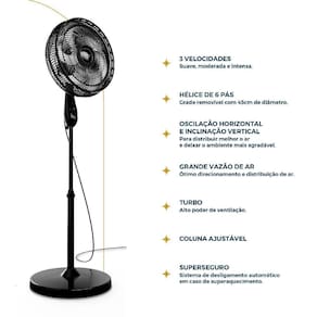 ? Hélice Maxx Force com 6 pás de 40cm ? 3 velocidades ajustáveis: suave, moderada e intensa ? 3 níveis de inclinação vertical + oscilação horizontal automática ? Sistema de segurança contra superaquecimento ? Grade removível de 48cm para facilitar a limpeza ? Classificação energética A mais economia ? Modelo coluna, ideal para diversos ambientes.
