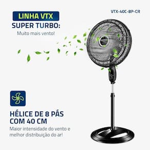 O Ventilador Super Turbo VTX-40C-8P-CR possui 40 cm de diâmetro e hélice de 8 pás, que promove uma circulação de ar mais eficiente e garante frescor ao ambiente. A coluna ajustável varia entre 1,19 m e 1,50 m, permitindo regular a altura do vento conforme a necessidade. Acompanha controle remoto com painel touch, oferecendo mais praticidade para ajustar a velocidade à distância.