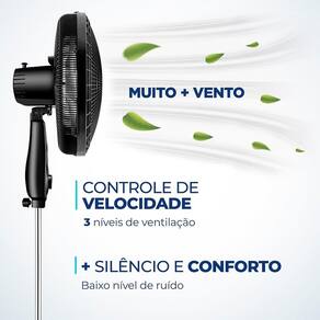 Características Adicionais: Vento Super Power Alça de Transporte Porta-Fios Embutido Grade Frontal Removível: Facilidade na Limpeza Coluna Ajustável: Possui Regulagem de 1,19 a 1,50 Metros Controle de Velocidade: Máxima Turbo, Média Conforto, Mínima Silencioso Maior Distribuição de Ar: através do sistema oscilante contínuo, o raio de alcance do vento é ampliado no ambiente