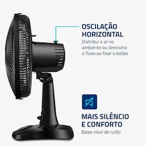 O sistema de oscilação horizontal amplia o alcance da ventilação, enquanto o botão de trava permite manter o ar direcionado.