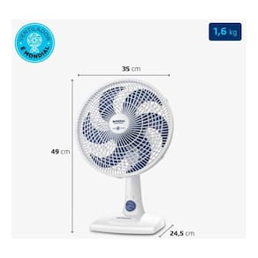 Especificações: Voltagem: 220V Potência: 60W Cor: Branco 3 Velocidades 6 Pás Inclinação regulável Sistema Oscilante Contínuo Baixo ruído Grade frontal removível Alça de transporte e porta-fio Diâmetro: 30cm Dimensões: 51x35x28 cm (AxLxP)