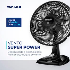 Com 40cm e 3 velocidades, o Ventilador de Mesa Mondial 6 Pás Super Power VSP-40-B garante vento mais forte. Ele tem baixo nível de ruído, sistema oscilante lateral, inclinação vertical regulável, além ser compacto e ter baixo consumo. Sua hélice tem design aerodinâmico, o que proporciona um vento forte.