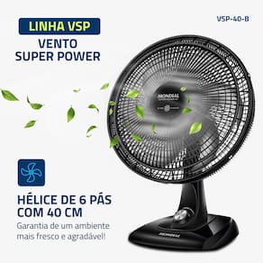 O ventilador Super Power VSP-40 possui 40 cm de diâmetro e hélice com 6 pás, garantindo um ambiente mais refrescante e agradável. Já o sistema de ventilação da Mondial apresenta baixo nível de ruído e assegura o silêncio necessário para momentos de concentração e uma excelente noite de sono.