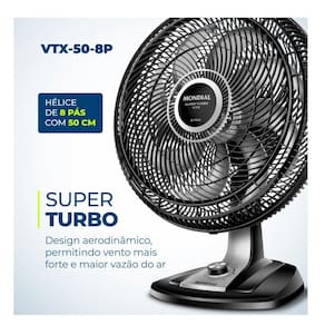 O ventilador de mesa Super Turbo VTX-40-8P possui 40 cm de diâmetro e hélice de 8 pás promove uma circulação de ar mais eficiente e garante mais frescor ao ambiente. O sistema de ventilação alia a potência para refrescar ao baixo nível de ruído, proporcionando o silêncio necessário para momentos de concentração e uma excelente noite de sono.