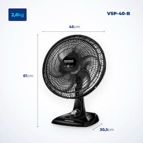 O Ventilador Super Power VSP-40-B da Mondial possui 40 cm de diâmetro e hélice com 6 pás, garantindo um ambiente mais refrescante e agradável. Já o sistema de ventilação da Mondial apresenta baixo nível de ruído e assegura o silêncio necessário para momentos de concentração e uma excelente noite de sono. Além disso, possui inclinação vertical regulável, alça de transporte + porta-fio e 3 opções de velocidades, Máxima Turbo, Média Conforto e Mínima Silencioso. Aproveite a qualidade que só a Mondial oferece!