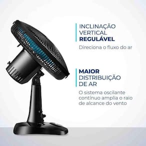 MOBILAR ELETRO HÁ 30 ANOS INOVANDO EM PRODUTOS E VENTILADOR DE PISO OU BANCADA MONDIAL SILENCIOSO 6 PAS TURBO Com 30 CM e 3 VELOCIDADES, o Ventilador branco Super Power VSP-30-AP é mais vento. Ele tem BAIXO NÍVEL DE RUÍDO, SISTEMA OSCILANTE lateral, INCLINAÇÃO VERTICAL REGULÁVEL, além ser compacto e ter baixo consumo. Sua HÉLICE TEM DESIGN AERODINÂMICO, o que proporciona um vento forte. Como ele faz MENOS BARULHO, com qualquer uma das 3 VELOCIDADES, você dorme com ventinho e silêncio garantidos. Para AMBIENTES MAIS AMPLOS, você pode usar seu SISTEMA OSCILANTE. Já sua INCLINAÇÃO VERTICAL REGULÁVEL DIRECIONA O FLUXO DE AR para cima ou para baixo. Como a GRADE FRONTAL É REMOVÍVEL, ele ainda é FÁCIL DE MONTAR e desmontar para limpeza. Ele também é FÁCIL DE CARREGAR porque tem uma alça para . Já a BASE ANTIDERRAPANTE traz mais . O Ventilador 30cm Super Power VSP-30-AP foi desenvolvido para USO DOMÉSTICO, sendo melhor para uso residencial. Tudo isso com 1 ANO DE GARANTIA MONDIAL. A Mondial é a escolha de milhões de consumidores. Cor Preto/Azul Voltagem (Tensão) Preto/Azul Petróleo Itens inclusos 01 Ventilador e 01 Manual de Instruções Potência 60W Dimensões do produto 51,00x35,00x28,00 de velocidades 3 Quantidade de pás 6 Coluna ajustável * Tipo de ventilador Ventilador de mesa Peso 1,60 Inclinação regulável Sim Oscilante Sim Garantia 1 Ano