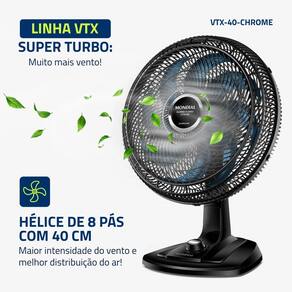 O Ventilador de Mesa Super Turbo VTX-40-Chrome da Mondial possui 40 cm de Diâmetro e Hélice de 8 pás, o que promove uma circulação de ar mais eficiente e garante mais frescor ao ambiente. O sistema de ventilação alia a potência para refrescar ao baixo nível de ruído, proporcionando o silêncio necessário para momentos de concentração e uma excelente noite de sono.