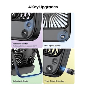 - Carregamento USB-C conveniente e tela intuitiva — Equipada com uma porta de carregamento USB-C para compatibilidade universal e carregamento mais rápido, esta ventoinha também possui uma tela embutida que indica claramente a carga restante da bateria e a configuração da velocidade atual, permitindo um controle fácil e tranquilidade
