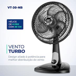 O ventilador Turbo VT-30-NB possui 30 cm de diâmetro, hélice com 6 pás e um design aerodinâmico que garante um ambiente mais fresco e arejado. Já o sistema de ventilação da Mondial apresenta baixo nível de ruído e assegura o silêncio necessário para momentos de concentração e uma excelente noite de sono. As 3 opções de velocidade permitem adequar o vento à sua necessidade: Máxima Turbo, Média Conforto e Mínima Silencioso.