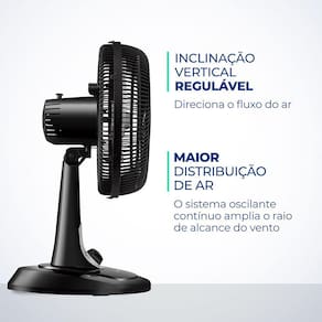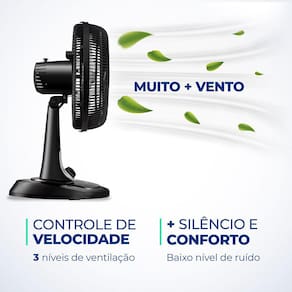 CARACTERÍSTICAS: - Vento Turbo - Mais Silêncio e Conforto - 6 Pás - Controle de velocidade - 3 velocidades - Inclinação vertical regulável - Alça de transporte e Porta-Fio