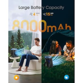 - ???Bateria com capacidade de 8000mAh?- Com uma capacidade de bateria de 8000mAh, este ventilador operado por bateria pode funcionar por 4-15 horas com uma única carga, garantindo resfriamento contínuo sem a necessidade de recarga constante. Seu design elegante complementa qualquer decoração, tornando-o perfeito para uso em casa, no escritório ou até mesmo em acampamentos ao ar livre.