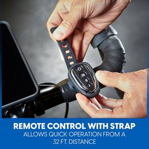 - [CONTROLE REMOTO COM ALÇA] — Opere o motor pneumático à distância. Prenda o controle remoto em sua bicicleta ou esteira para ajustar a velocidade sem interromper o treino. Distância efetiva de controle remoto de 32 pés. Controle remoto + baterias incluídas.
