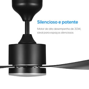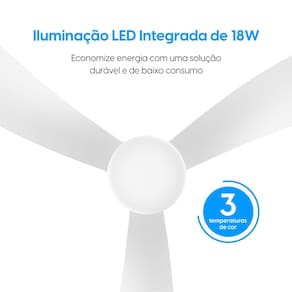 A iluminação integrada em LED de 18W oferece três temperaturas de cor (3.000K, 4.000K e 6.500K), garantindo maior versatilidade para diferentes ambientes de sua casa. O ventilador acompanha um controle remoto que permite ligar e desligar o aparelho, ajustar a velocidade, regular a temperatura da luz e acionar o timer programável para desligamento automático.