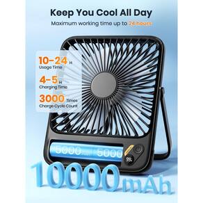 - Desempenho de resfriamento poderoso e eficiente: equipado com uma bateria recarregável de 10000mAh de alta capacidade, mantenha-se fresco o dia todo com até 10 a 24 horas de operação contínua com uma única carga completa. Suas configurações de 4 velocidades e design de 5 lâminas fornecem resfriamento poderoso e silencioso, tornando-o perfeito para escritórios, residências e aventuras ao ar livre