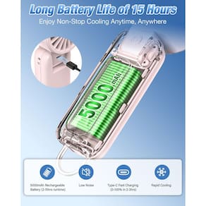 - O ventilador pessoal possui uma bateria recarregável de 5000 mAh, totalmente carregada até uma longa vida útil de 2 a 15 horas (dependendo das diferentes velocidades). Carregamento rápido tipo C, totalmente alimentado em apenas 2-3 horas e funciona com laptops, carros, carregadores portáteis e tomadas USB, que podem ser carregados a qualquer hora, em qualquer lugar. Perfeito para qualquer lugar: viagens, trabalho, escritório ou casa - o resfriamento segue você