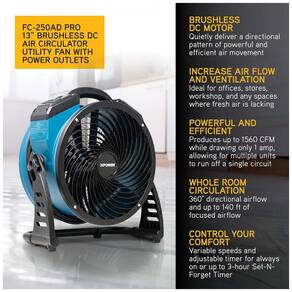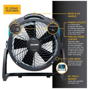 O ventilador industrial XPOWER FC-250AD é equipado com motor brushless DC avançado, proporcionando alto desempenho com baixo consumo de energia, operando com apenas 1 ampere mesmo em potência máxima. Gera um fluxo de ar de até 1560 CFM (aproximadamente 44,2 metros cúbicos por minuto), ideal para ventilação eficiente em ambientes internos como residências, escritórios e pequenos espaços industriais. Oferece controle de velocidade variável para ajuste preciso do fluxo de ar conforme a necessidade, além de timer programável de 3 horas para desligamento automático. Possui design robusto com grelha em espiral exclusiva e tecnologia Air Fin para fluxo de ar focado e estendido, alcançando até 43 metros de distância. A base permite rotação de 360° para ajuste do ângulo do fluxo. Conta com duas tomadas integradas (daisy chain) para uso simultâneo de múltiplos aparelhos no mesmo circuito. Portátil, possui alça para transporte e cabo revestido resistente. Produto certificado ET e CETL.