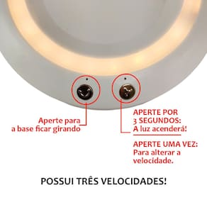 Ventilador possui led em sua base, que ilumina o ambiente e facilita para fazer maquiagens, leituras e outros.
