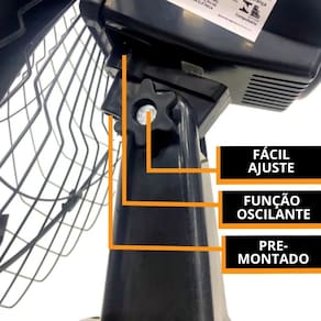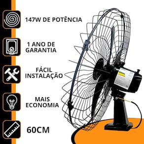 Atributos e Benefícios: - Motor potente: Potência de 147W para um desempenho eficiente em ventilação. - Oscilação automática que garante distribuição uniforme do ar. - Estrutura pré-montada e kit de fixação para instalação rápida. - Ventilador já vai semi-montado - Grade de 60 cm e hélice de 52 cm - Motor eficiente de alto desempenho - Hélice 3 Pás com design aerodinâmico - Ajuste de velocidade deslizante gradual - Rendimento com grande economia e eficiência energética A - Suporte nivelador - Fácil instalação - Controle de velocidade com chave de controle
