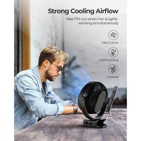- Silencioso, mas forte: mantém o ar fluindo e fresco a qualquer hora, em qualquer lugar. A engrenagem mais alta do ventilador de clipe pode trazer uma forte velocidade do vento de 5,3 m/s. Na configuração mais baixa, controlamos o ruído abaixo de 35 dB. Você pode desfrutar do vento silencioso enquanto descansa ou se refresca ao se exercitar/acampar ao ar livre