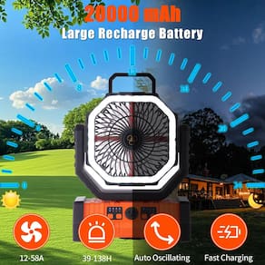 -?Bateria recarregável poderosa de 20000mAh?Este ventilador de acampamento recarregável com uma bateria interna de alta capacidade leva apenas 8 a 10 horas para ser totalmente carregado usando o cabo tipo C, com duração de 14 a 60 horas em diferentes modos, garantindo um sono tranquilo à noite. Diga adeus à ansiedade da bateria durante acampamentos, furacões ou quedas de energia de emergência. A porta de saída de 5V/3A garante que seus dispositivos essenciais, como telefones, GPS e outros equipamentos de acampamento, permaneçam carregados e prontos para uso.