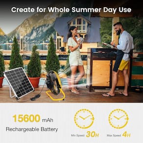 - OPÇÃO DE ENERGIA DO PAINEL SOLAR DE 20W: Este ventilador de chão recarregável com opção de carregamento solar de 20 W, normalmente de 6 a 10 horas para totalmente carregado de acordo com a intensidade da luz solar. O painel solar com cabo de 5 metros de comprimento é mais conveniente para uso externo.
