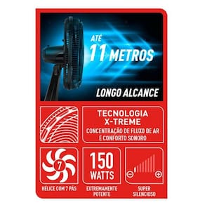 Com longo alcance de ar de ate 11 metros o Ventilador X-treme 7 conta com a Power Zone, uma area concentrada que garante o maximo de vento direcionado, oferecendo performance superior para que voce nao sofra com o calor e possui a exclusiva grade Chevron Zone que proporciona um conforto muito maior do som.