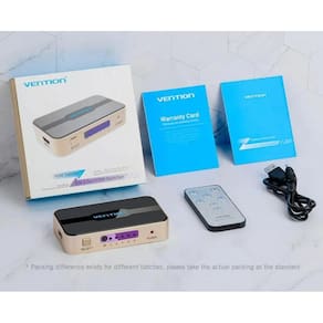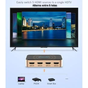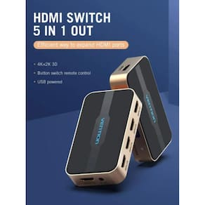 Parâmetros do Produto Marca: Vention Nome: interruptor 5 In 1 Out HDMI Modelo: ACDG0 Cor: Preto + Ouro Tipo de conector: HDMI A fêmea, porta de alimentação DC Versão: HDMI 1.4 Conector: banhado a ouro Resolução: 4K 30 Hz Direção de transmissão: HDMI para HDMI INPUT para OUTPUT Material da Casca: Liga de Alumínio + ABS Chip: PI3HDMI301 Faixa de temperatura de trabalho: -10 a +50 graus Celsius Faixa de umidade operacional: 5 a 80% Alimentação: DC 5V / 1A Luz indicadora: LED indicador de energia, 5 indicadores de sinal Linha de entrada de suporte: 10-15m Linha de saída: 10-15m Ean: 7897523132270