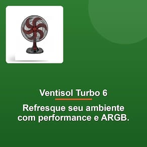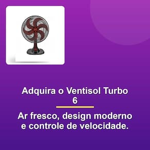 Redesenhado para maior estável e modernidade, o Ventisol Turbo 6 possui uma base e acabamento de grade arrojados. O controle na capa protetora do motor permite ajustes de três velocidades, otimizando seu nível de frescor. O sistema Wind-line na grade garante um fluxo de ar direcionado e potente, enquanto a funcionalidade de oscilação automática protege uma área maior.