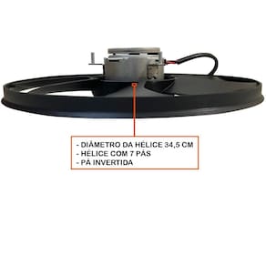 - diâmetro da hélice 34,5 cm - diâmetro do motor 10 cm motor baixo - hélice com 7 pás - potência 60/250w - rotação sentido anti-horário - conector 3 pinos - pá invertida