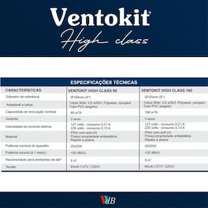 Ventokit High Class C160 Bivolt O High Class é o mais novo renovador de ar linha Ventokit, que alia design e desempenho em um só produto. O High Class conta com led indicador de funcionamento e baixo nível de ruído, além de instalação facilitada. Promove a ventilação mecânica do ambiente, evitando a formação de mofo, umidade e mau cheiro.