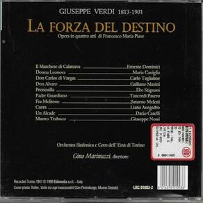 La forza del destino é uma ópera italiana de Giuseppe Verdi, com libretto de Francesco Maria Piave baseado num drama espanhol, Don Álvaro, o La Fuerza del sino 1835 , por Ángel de Saavedra, duque de Rivas, com uma cena adaptada de Friedrich Schiller Wallensteins Lager. A estreia ocorreu no Teatro Bolshoi Kamenny de São Petersburgo, na Rússia, em 10 de novembro de 1862. Orchestra Sinfonica e Coro dell' Eiar di Torino. Gino Marinuzzi, diretor Marca: Não Informado Ean: 8014394010936
