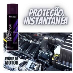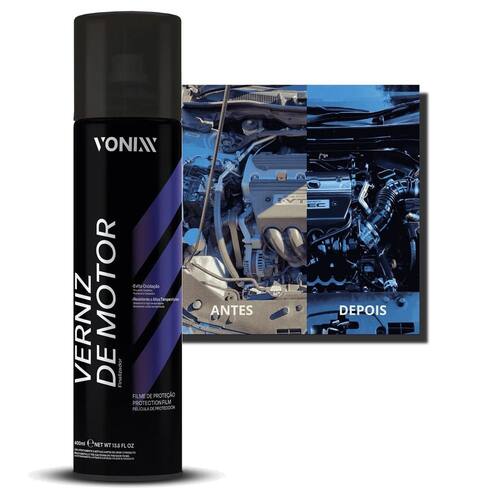 O Verniz de Motor Vonixx protege, dá brilho e renova todas as superfícies existentes no cofre do motor, como partes metálicas, plásticas, superfícies pintadas e mangueiras de borracha. O produto forma um filme levemente lubrificado resistente a altas temperaturas e protege por até 6 meses.MODO DE USO:Obs.: Aplicar o produto em ambiente aberto e com o motor desligado.1- Certifique-se de que a superfície esteja limpa, seca e fria.2- Aplique uma pequena névoa do produto até cobrir totalmente a peça.3- Aguarde secar por 15 minutos.4- Caso prefira um acabamento mais fosco, remova o excesso com uma toalha de microfibra limpa e seca.FILME DE PROTEÇÃO | EVITA OXIDAÇÃO | RESISTENTE A ALTAS TEMPERATURAS