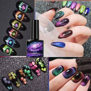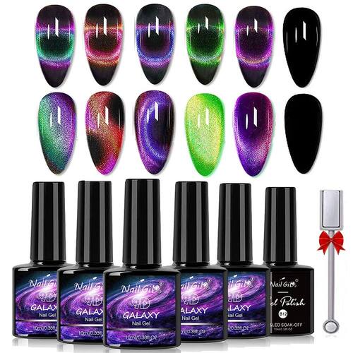 Esmalte em gel olho de gato 9D - Conjunto de esmalte de gel Magic 9D de cores duplas: o kit de esmalte de gel inclui 5 peças de esmalte de gel de gato 9d de duas cores e gel de cores pretas, 1 bastão magnético de cabeça dupla. Uma ótima opção de presente para aniversário, festa, Halloween e Natal - Efeito gel olho de gato 9D: use gel de base preta e bastão magnético para manter o olho de gato preto, você pode obter um resultado incrível ao misturar a cor! Mudança de cor atraente e efeitos de olho de gato serão fenomenais e magníficos! Efeitos diferentes dependendo da luz e do ângulo - Efeito camaleão e galáxia: use gel de base preta e não use bastão magnético para obter efeito camaleão. Use gel de base preta e bastão magnético para obter efeito de galáxia - Efeito brilhante: use gel de base transparente para obter um efeito de glitter transparente. Esmalte multifuncional, um gel completa uma variedade de estilos - Dicas: teste de pele antes de usar. Ao aplicar, é necessário curá-lo sob a lâmpada por 30-60s. O esmalte de gel galaxy dura 28 dias com brilho perfeito sob aplicação adequada. Se você tiver algum problema, peça ajuda ao nosso artista de unhas profissional