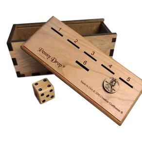 Este é um jogo incrível e divertido que pode ser jogado ao redor da mesa ou ao redor do bar. Seja o primeiro a se livrar de todos os seus centavos! Este é um jogo projetado e fabricado nos EUA (Flórida) com base na descrição de um jogo que um homem de 95 anos me descreveu que jogou quando menino e não tinha visto desde então. Criamos uma caixa que é funcional e bonita. As laterais e a parte inferior são feitas de material de tábua de chão para durabilidade, resistência a arranhões e resistência à água. A parte superior é de cerejeira. O texto é gravado a laser profundamente. Fizemos um centavo de madeira para usar como alça para abrir a tampa deslizante. Inclui um dos nossos dados feitos à mão e a laser de 7/20.3 cm. Este jogo premium Penny Drop é uma marca registrada de direitos autorais da Creative Crafthouse, Hudson FL; design de Dave Janelle. REGRAS: Para 2 ou mais jogadores, cada jogador precisa de 12 centavos: você pode usar 10 centavos se quiser fazer um jogo mais rápido. O objetivo do jogo é ser o primeiro a se livrar de todos os seus centavos. 1. Determine quem vai primeiro com cada jogador jogando o único cubo de dados. O número mais alto vai primeiro; depois o jogo prossegue no sentido horário. 2. O jogador rola o dado e deve colocar um centavo no slot do tabuleiro de jogo correspondente ao número mostrado no dado. 3. Se o jogador rolar um número que já tenha um centavo, ele deve pegar todos os centavos exibidos no tabuleiro e, em seguida, o turno vai para o próximo jogador 4. Um jogador deve fazer pelo menos uma jogada, mas pode levar quantas jogadas quiser até ficar preso, como na regra nº 3. 5. O buraco número 6 permite que o centavo entre na caixa para que você possa rolar o máximo possível de 6 sem penalidade 6. O jogo continua até que um jogador fique sem centavos e seja declarado vencedor. Os centavos são redistribuídos para começar o próximo jogo. 7. Uma maneira divertida de apostar no jogo seria cada jogador colocar um quarto ou uma quantia de dinheiro dentro da caixa antes do início do jogo. O vencedor receberá esse dinheiro.