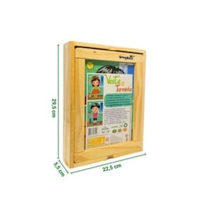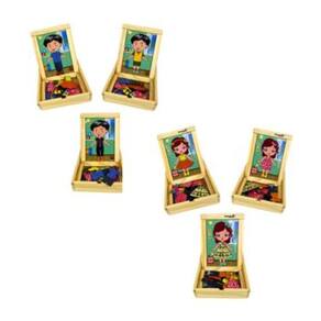 O Veste a Turminha é um brinquedo educativo magnético em madeira. Composto por 22 peças, o kit vem em uma caixa de madeira com tampa dupla face magnética, ilustrada com a imagem de um menino de um lado e uma menina do outro, formando o cenário perfeito para brincar. A tampa se encaixa no centro da caixa, servindo de suporte para que a criança possa vestir os personagens com roupas e acessórios magnéticos, criando diversas combinações.