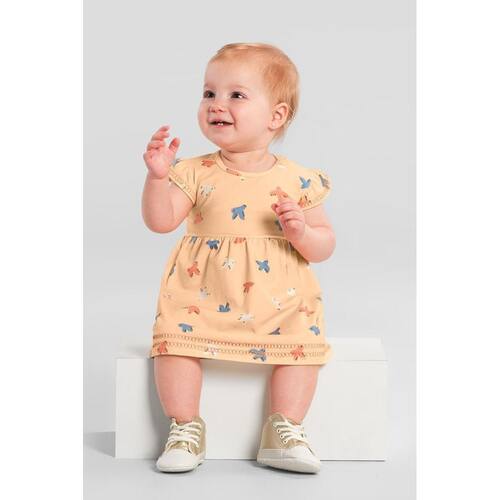 Encante-se com o vestido bebê menina da Brandili, confeccionado em cotton macio e leve. Com uma adorável estampa colorida de passarinhos, este vestido apresenta gola redonda e mangas curtas, garantindo conforto e frescor para os dias mais quentes. As pregas proporcionam um efeito rodado encantador, ideal para qualquer ocasião. Combine com um laço no cabelo e sapatinhos para um look irresistível que fará sua pequena brilhar!