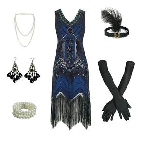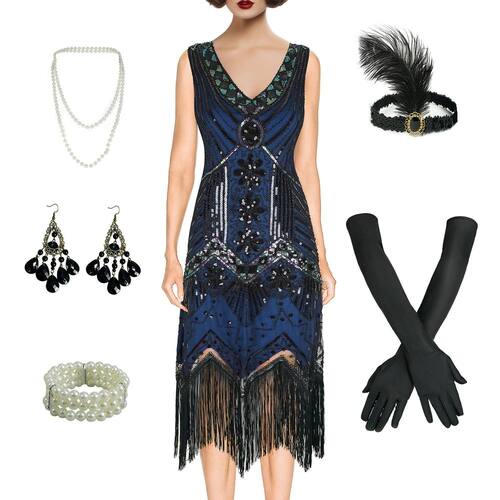 BONGZUO Vestido feminino estilo melindrosa anos 20, vintage, renda com franjas, Gatsby, conjunto de acessórios dos anos 20 (Z3722BU, 3GG)