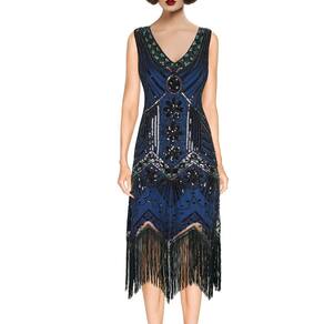 - Design: design listrado clássico dos anos 20 com detalhes de lantejoulas e miçangas para um padrão encantador. Design profundo com decote em V na frente e atrás; estilo colado ao corpo; comprimento midi; alças sem mangas e ajustáveis; totalmente forrado com lantejoulas e contas.