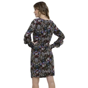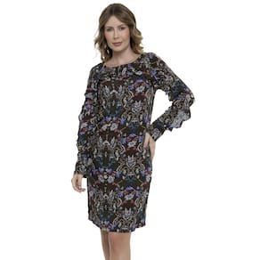 Vestido Curto Estampado Babado Mangas O vestido possui estampas delicadas. Tem caimento leve sob o corpo. Mangas com fechamento em botão, zíper nas costas e possui detalhes de babado acima do busto e vai até as mangas. \nPeso: 315 g Decote: Joia\nTamanho P M G\nComprimento 92 cm 98 cm 100 cm\nBusto 86 cm 92 cm 94 cm\nCintura 96 cm 98 cm 100 cm\nQuadril 80 a 100 cm 88 a 110 cm 90 a 118 cm\nMangas 63 cm 64 cm 65 cm Marca: Não Informado Marca: Não Informado Marca: Não Informado