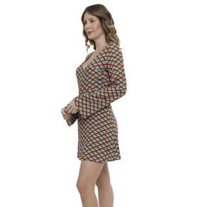 Vestido Curto Viscocrepe Manga Flare Botão Geométrico Azul