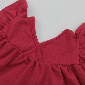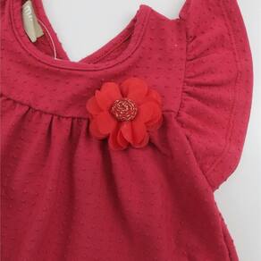 O destaque da peça é o delicado aplique de flor na lateral, que adiciona um charme romântico ao visual, além do decote elegante em V nas costas, que traz um toque moderno e diferenciado. A modelagem soltinha e as mangas curtas com detalhes franzidos garantem leveza e total liberdade de movimento, ideal para a rotina ou datas especiais.