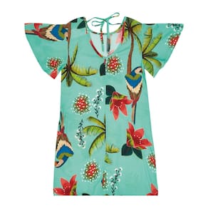 Flores, araras e coqueiros! O paraíso tropical em forma de vestido e beleza. O vestido na cor verde é confeccionado em tecido viscose, sendo perfeito para o dia a dia ou ocasiões especiais, seu detalhe é a amarração nas costas. É ou não é a cara do nosso paraíso brasileiro?\n